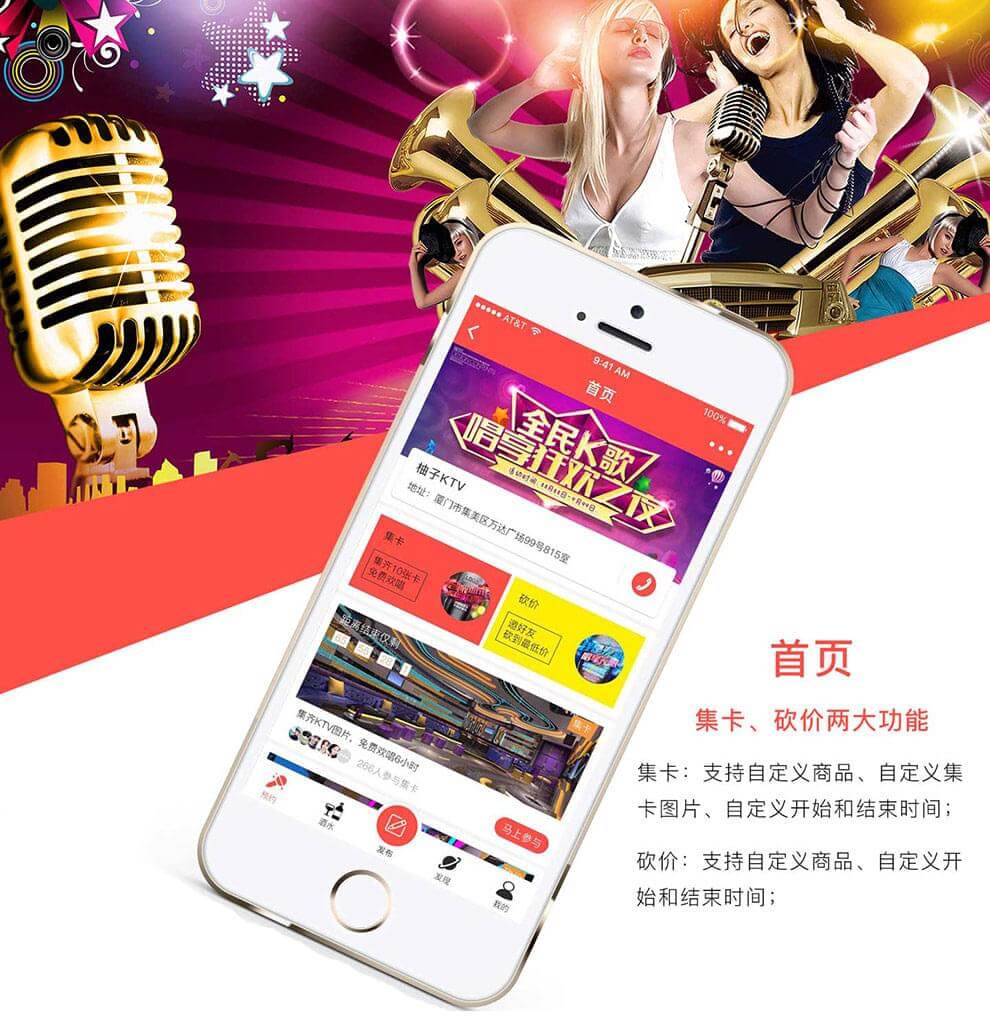 KTV微信小程序支持砍价、集卡、预约,商城。可预订任何包厢、酒水零食,所消费的总额可获得积分,积分兑换礼品,用户自定义;可以查看歌友发布的K歌信息,喜欢,评论,发布,互动交流...... 当前版本为连锁店版(商家手机端后台、店长手机端后台、服务生手机端后台)!